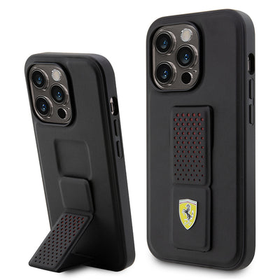 Apple iPhone 14 Pro Kılıf Ferrari Orjinal Lisanlı Klasik Metal Logolu Delikli Standlı Deri Kapak Siyah
