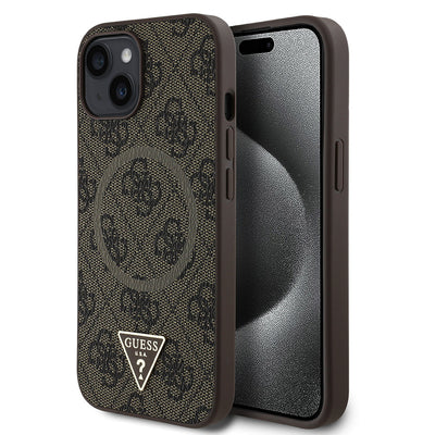 Apple iPhone 15 Kılıf Guess Orjinal Lisanslı Magsafe Şarj Özellikli PU Üçgen Logo 4G Desenli Kapak Kahverengi