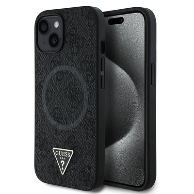 Apple iPhone 15 Kılıf Guess Orjinal Lisanslı Magsafe Şarj Özellikli PU Üçgen Logo 4G Desenli Kapak Siyah