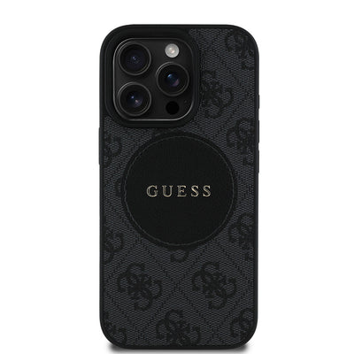 Apple iPhone 15 Pro Max Kılıf Guess Orjinal Lisanslı Magsafe Şarj Özellikli PU Halkalı 4G Desenli Yazı Logolu Kapak Siyah