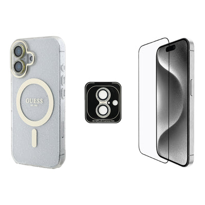 Apple iPhone 16 Guess Orjinal Lisanslı 3'lü Aksesuar Seti IML Baskılı Simli Glitter Kılıf + Ekran Koruyucu + Lens Koruyucu Şeffaf