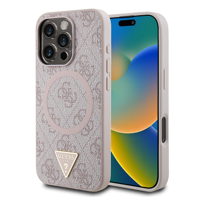 Apple iPhone 16 Pro Kılıf Guess Orjinal Lisanslı Magsafe Şarj Özellikli PU Üçgen Logo 4G Desenli Kapak Pembe