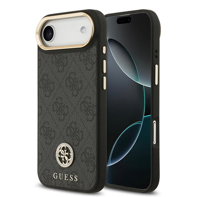 Apple iPhone 17 Air Kılıf Guess Orjinal Lisanslı M-safe Şarj Özellikli Gold Metal Kamera Çerçeveli PU Deri 4G Desenli Yazı Logolu Kapak Siyah
