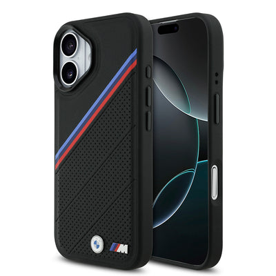 Apple iPhone 17 Kılıf BMW Orjinal Lisanslı M-safe Şarj Özellikli M Logolu Üç Şeritli Delikli Deri Kapak Siyah