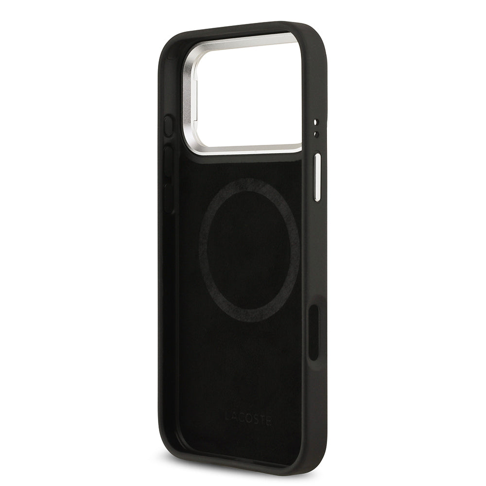 iPhone 17 Pro Max Kılıf Lacoste Orjinal Lisanslı M-safe Şarj Özellikli PU Pike Desenli Standlı Metal Logolu Kapak