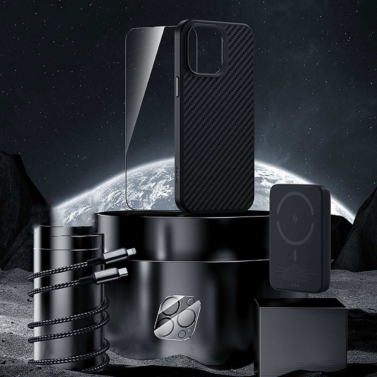 Bu lüks cep telefonu aksesuar seti, kaliteli kevlar malzemeden üretilen Benks telefon kılıfı, kaliteli cam ekran koruyucu, bir adet type-c şarj kablosu, lens koruyucu ve magsafe wireless şarj özellikli powerbank ile birlikte geliyor.