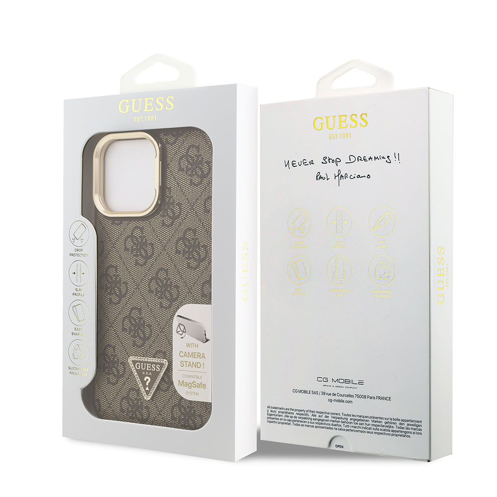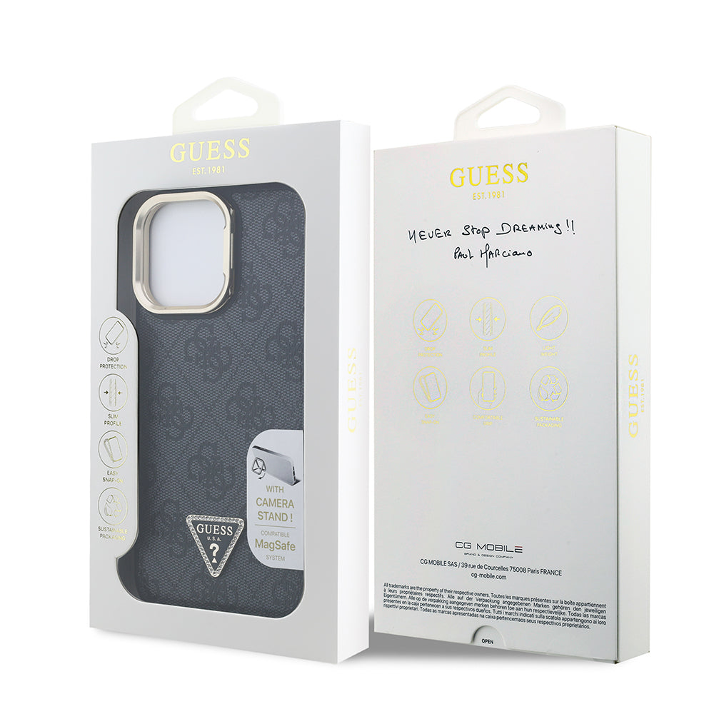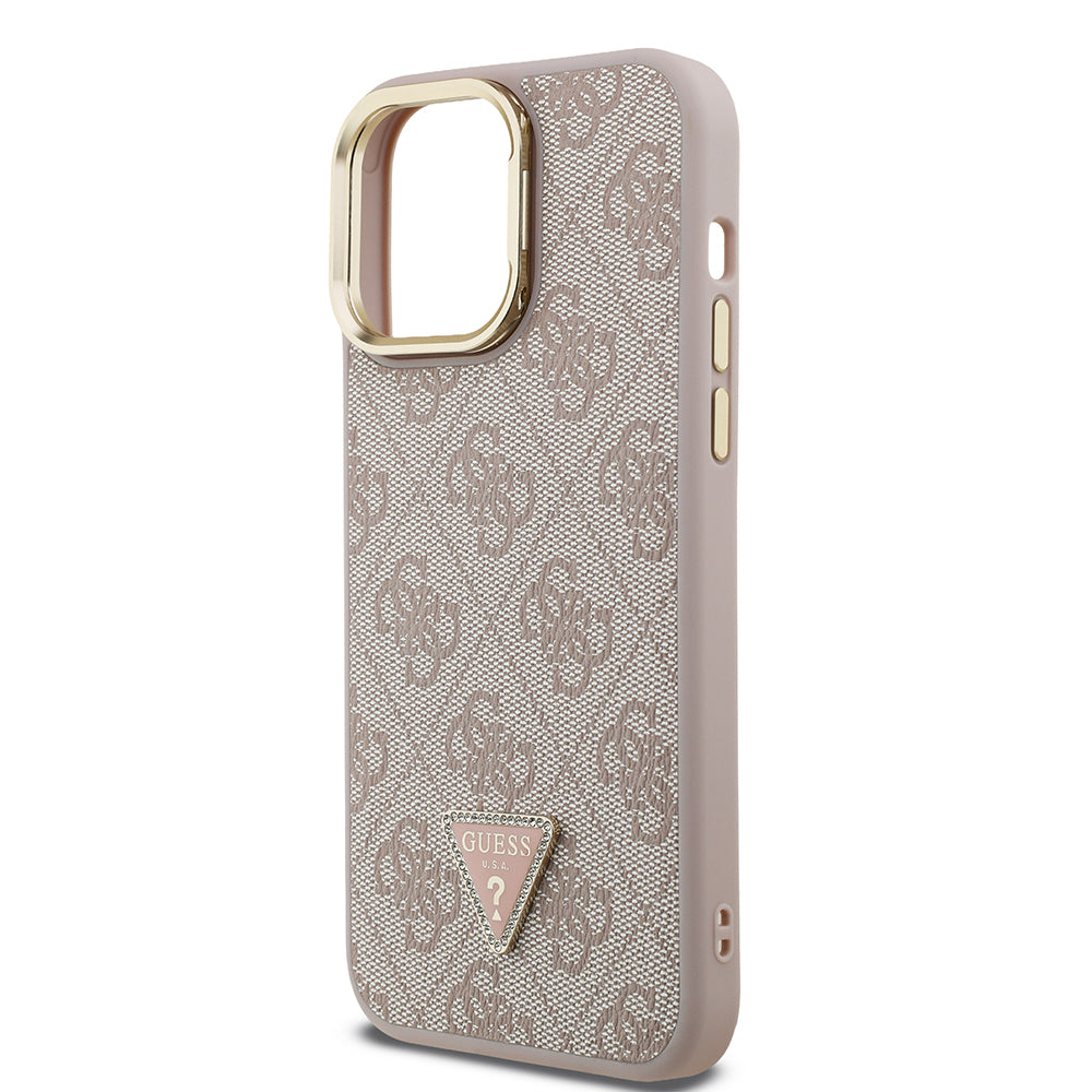 iPhone 14 Pro Max Kılıf Guess Orjinal Lisanslı PU Deri Taşlı Üçgen Logo 4G Desenli Kamera Standlı Kılıf