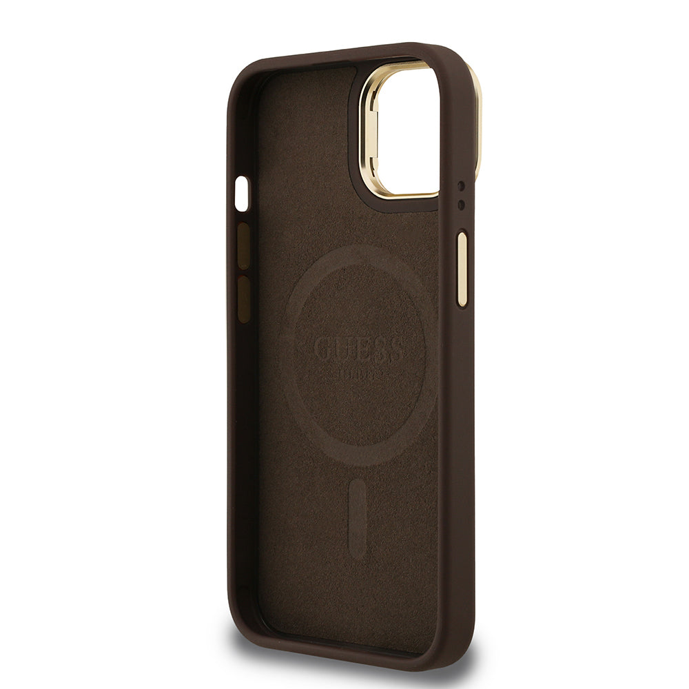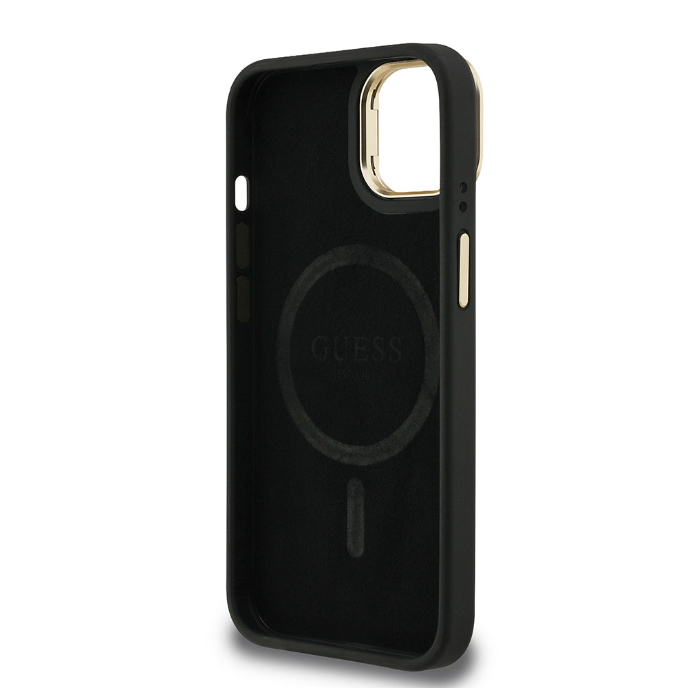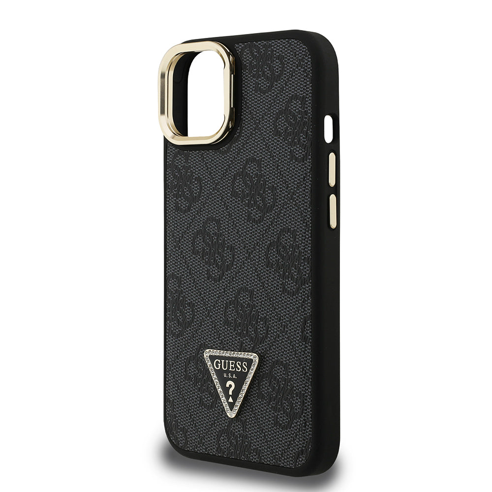 iPhone 15 Kılıf Guess Orjinal Lisanslı PU Deri Taşlı Üçgen Logo 4G Desenli Kamera Standlı Kılıf