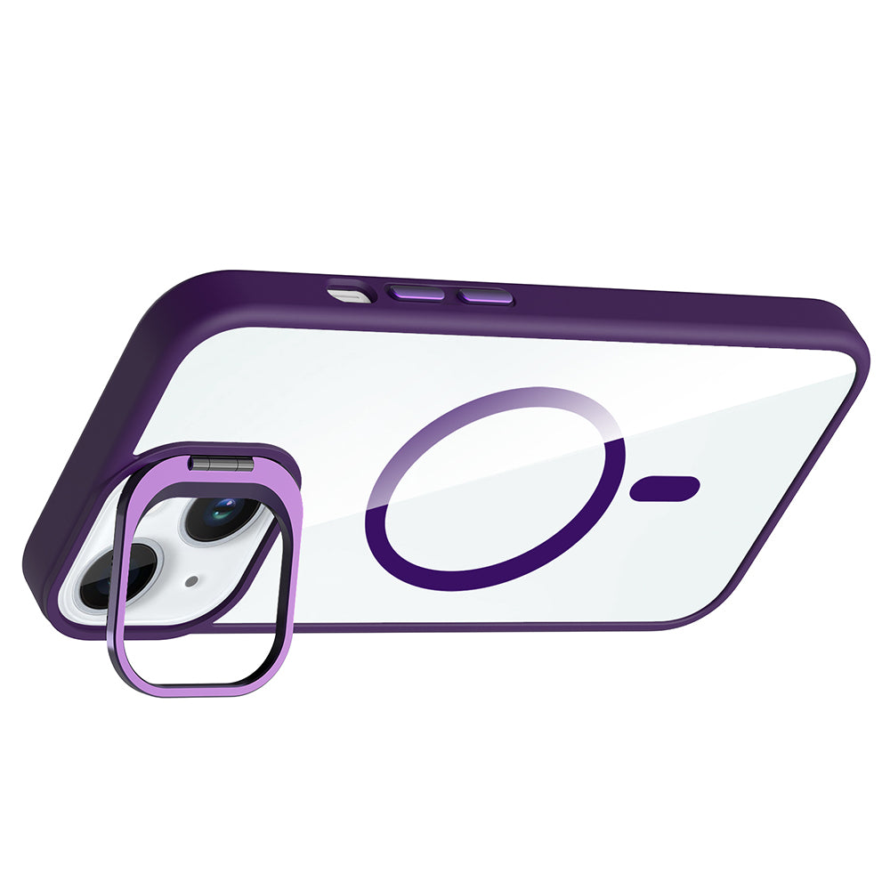 Apple iPhone 15 Kılıf Standlı ve Kamera Lens Hediyeli M-Safe Şarj Özellikli Zore Etro Kapak Derin Mor