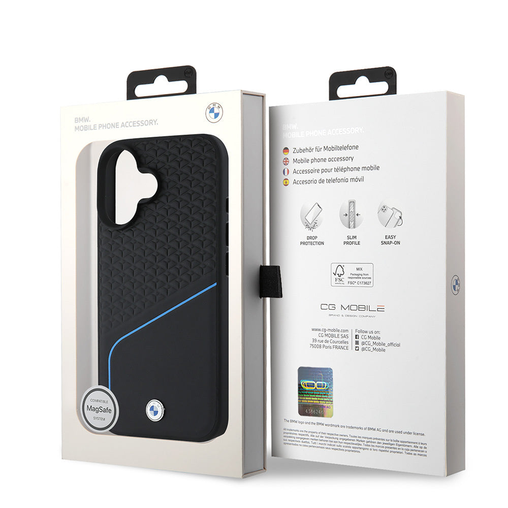 iPhone 16 Kılıf BMW Orjinal Lisanslı M-safe Şarj Özellikli Metal Logolu Dokulu ve Çizgili Deri Kılıf