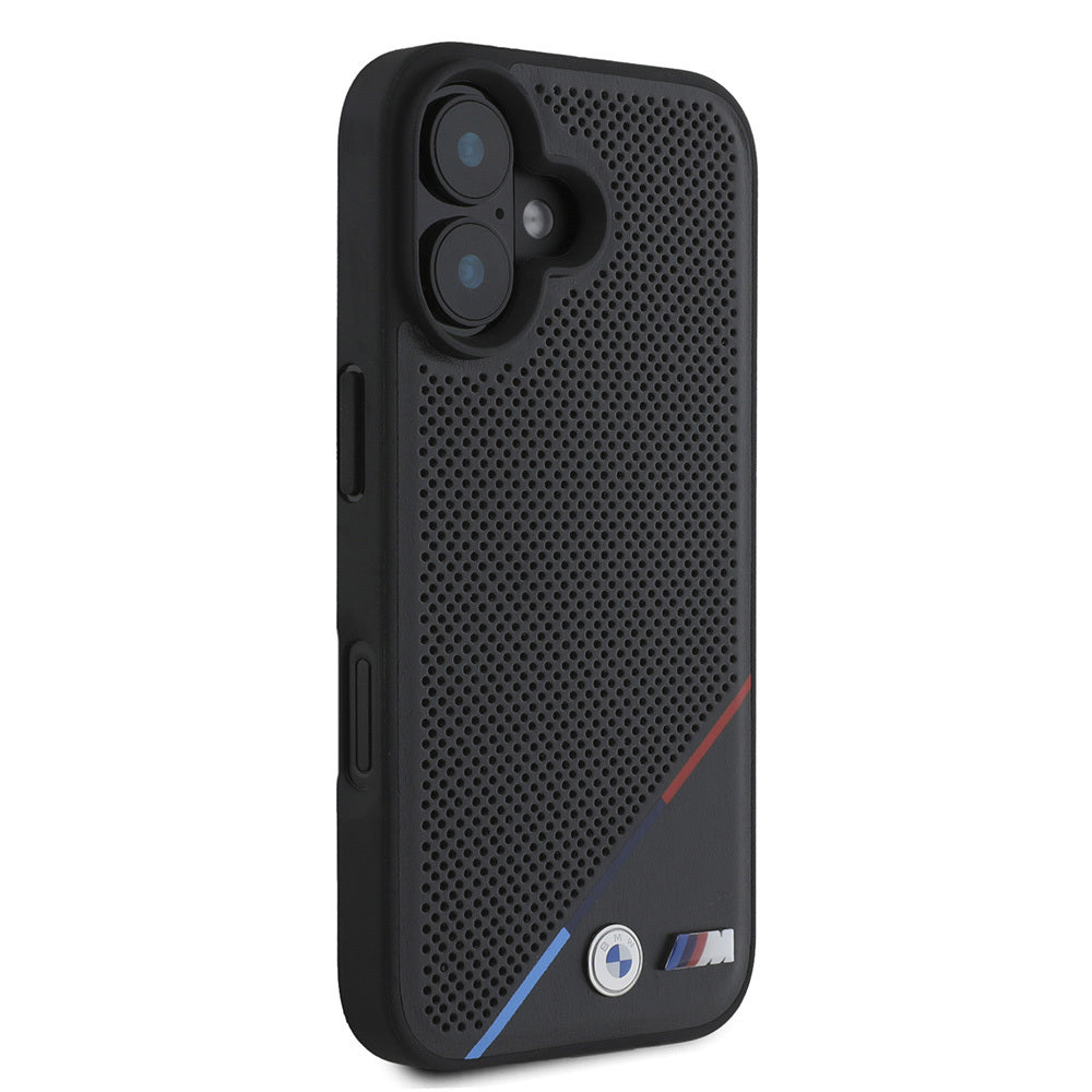 iPhone 16 Plus Kılıf BMW Orjinal Lisanslı Magsafe Şarj Özellikli M Logolu Üç Çizgili Delikli Deri Kapak