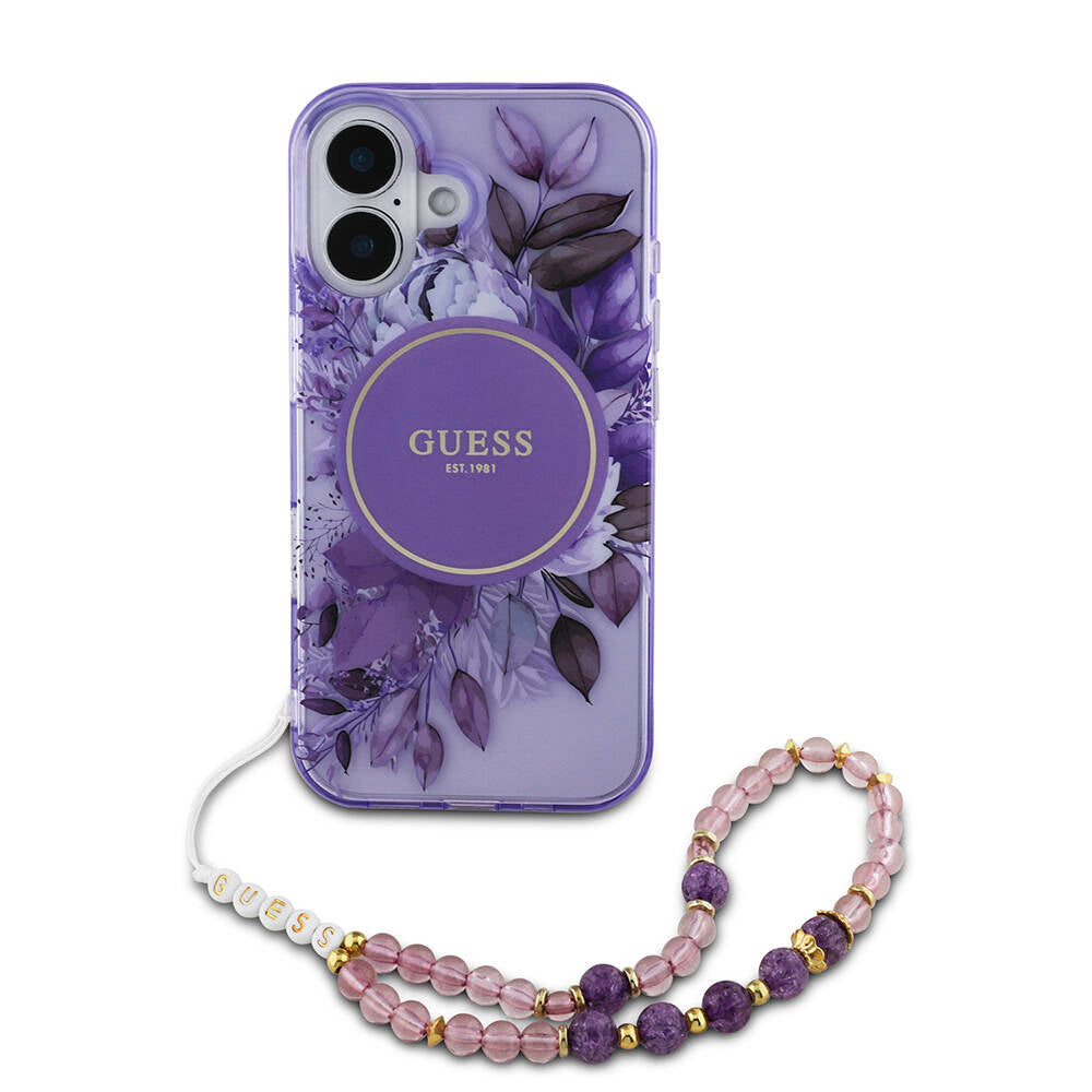 iPhone 16 Plus Kılıf Guess Orjinal Lisanslı Magsafe Şarj Özellikli IML Baskılı Çiçek İnci Bileklikli Kapak