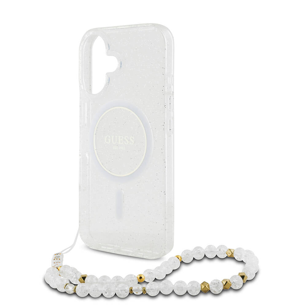 iPhone 16 Plus Kılıf Guess Orjinal Lisanslı M-safe Şarj Özellikli Simli Silikon İnci Bileklikli Kılıf
