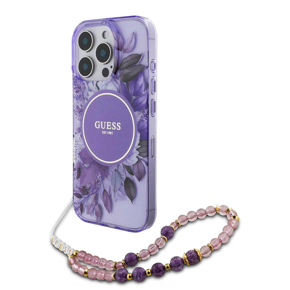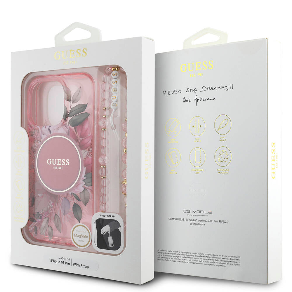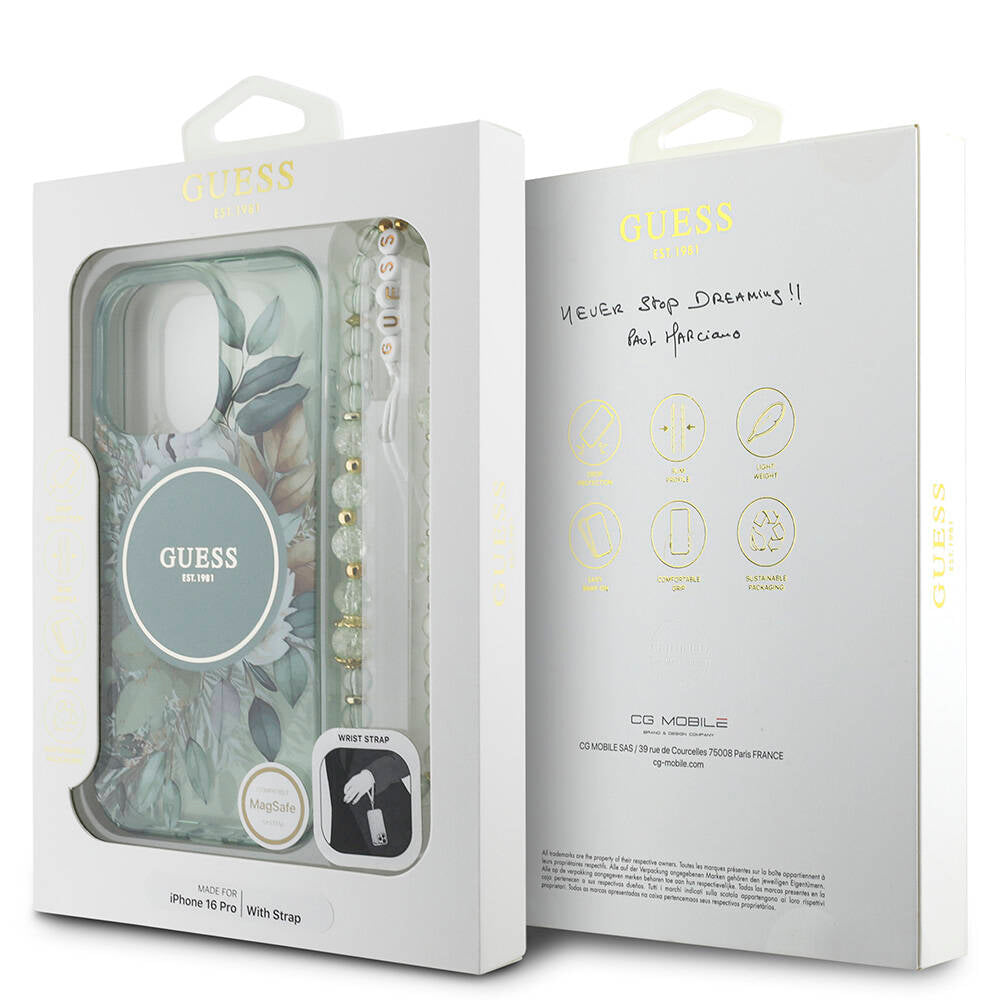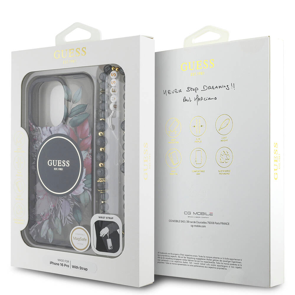 iPhone 16 Pro Kılıf Guess Orjinal Lisanslı M-safe Şarj Özellikli IML Baskılı Çiçek İnci Bileklikli Kılıf