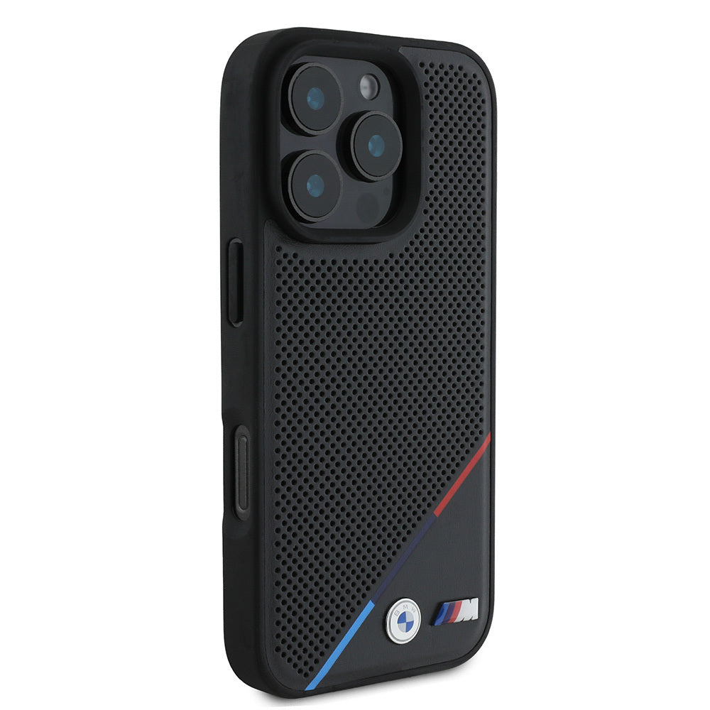 iPhone 16 Pro Max Kılıf BMW Orjinal Lisanslı M-safe Şarj Özellikli M Logolu Üç Çizgili Delikli Deri Kılıf