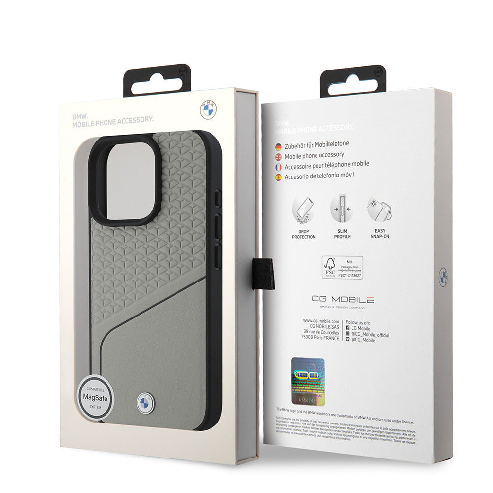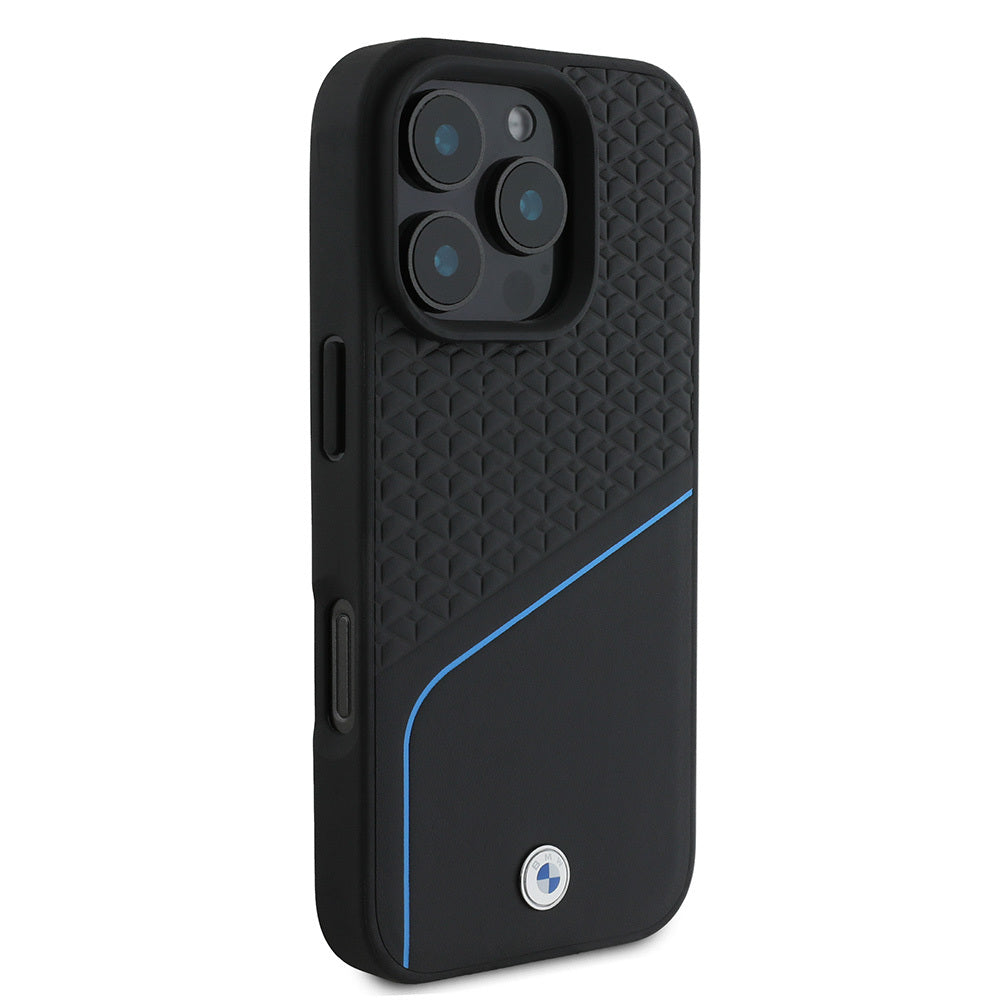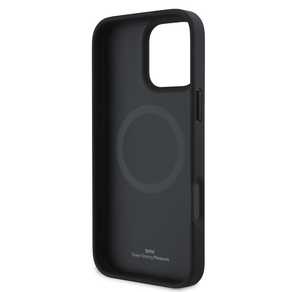 iPhone 16 Pro Max Kılıf BMW Orjinal Lisanslı M-safe Şarj Özellikli Metal Logolu Dokulu ve Çizgili Deri Kılıf