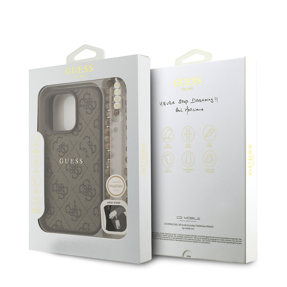 iPhone 16 Pro Max Kılıf Guess Orjinal Lisanslı M-safe Şarj Özellikli PU Deri Bilek Askı İpli Yazı Logolu Kılıf