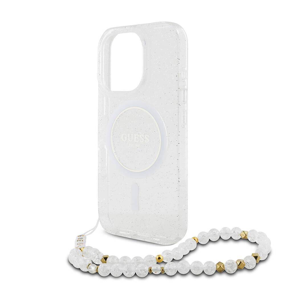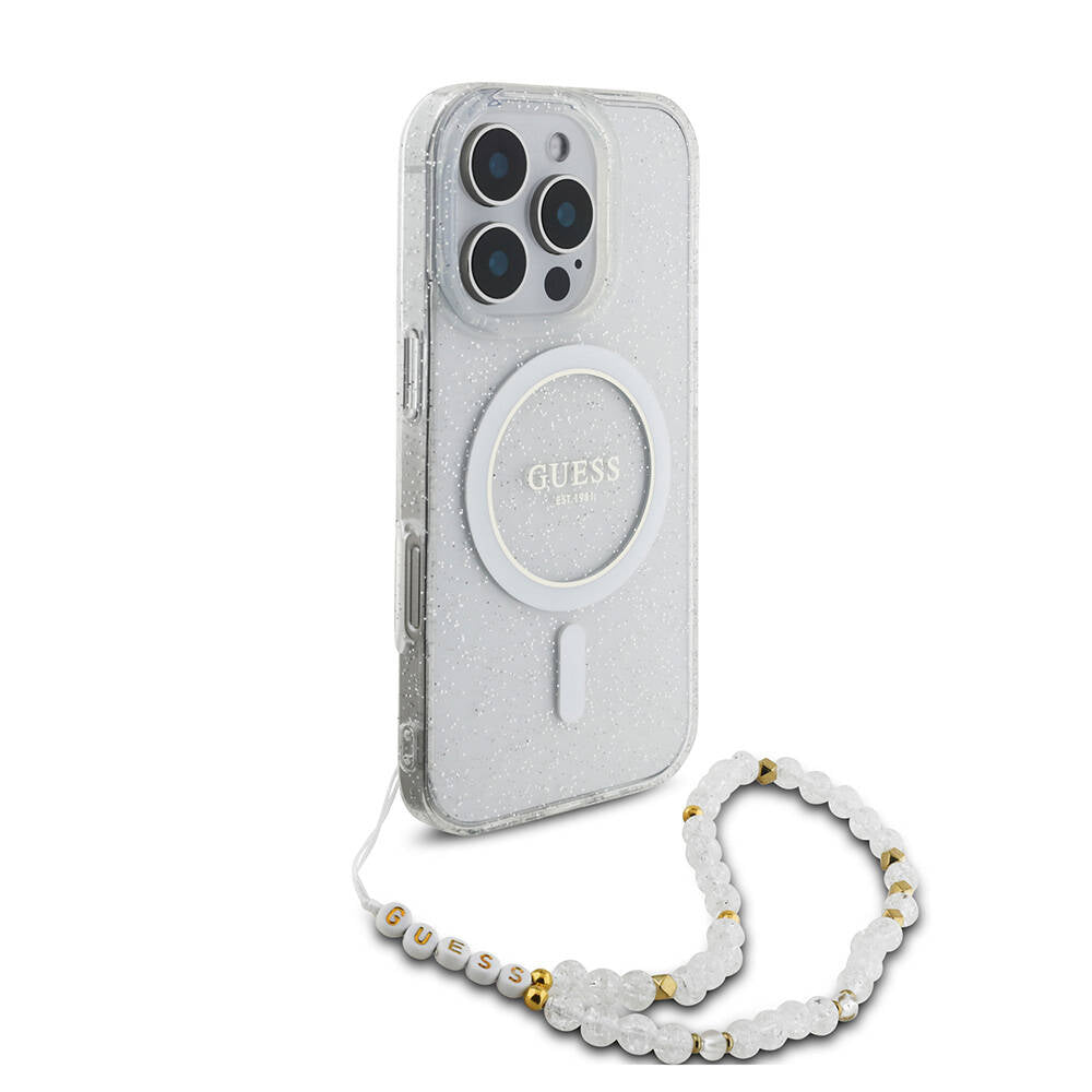 iPhone 16 Pro Max Kılıf Guess Orjinal Lisanslı M-safe Şarj Özellikli Simli Silikon İnci Bileklikli Kılıf