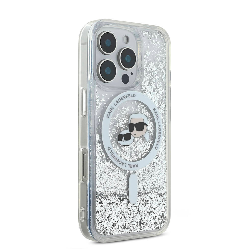 iPhone 16 Pro Max Kılıf Karl Lagerfeld Orjinal Lisanslı M-safe Şarj Özellikli Sıvılı Simli KC Heads Kılıf