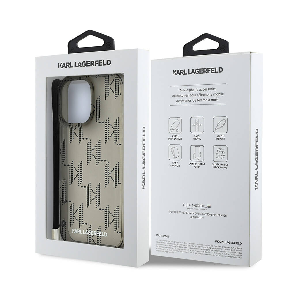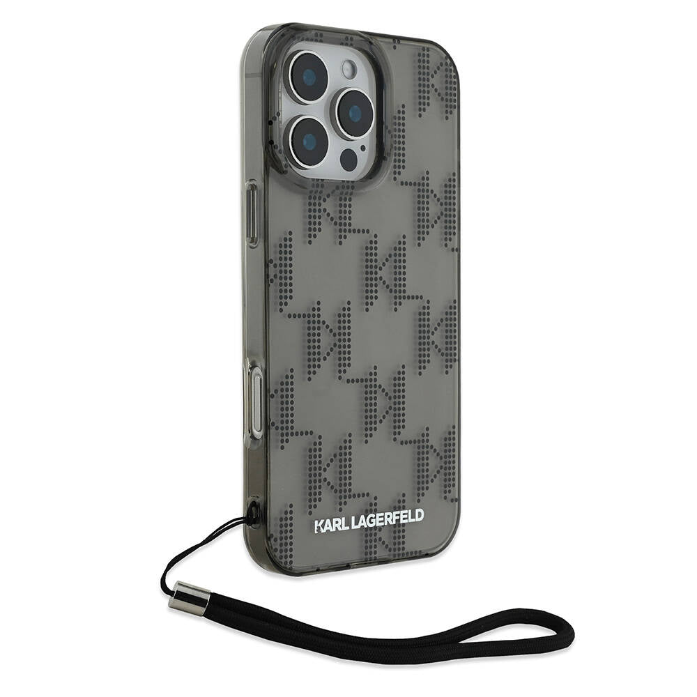 iPhone 16 Pro Max Kılıf Karl Lagerfeld Orjinal Lisanslı KL Desenli Saydam Bilek Askı İpli Klasik Logolu Kılıf