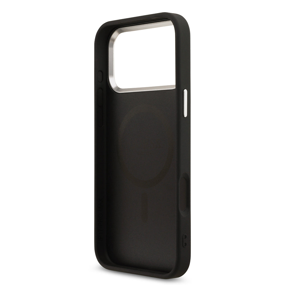 iPhone 17 Pro Max Kılıf Guess Orjinal Lisanslı M-safe Şarj Özellikli Gümüş Metal Kamera Çerçeveli Üçgen Logo 4G Desenli Kılıf