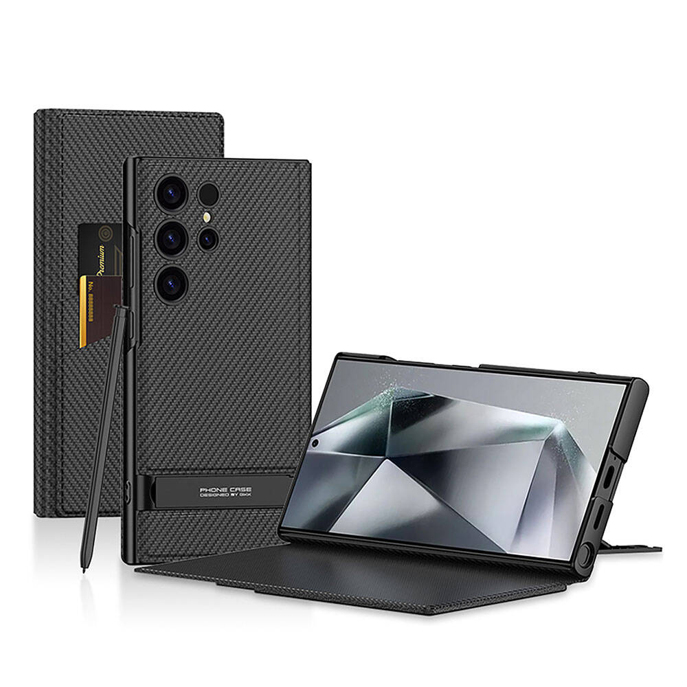 Galaxy S24 Ultra Kılıf Kamera Korumalı Karbon Tasarım Zore Droga Standlı Kartlıklı Kapaklı Kılıf
