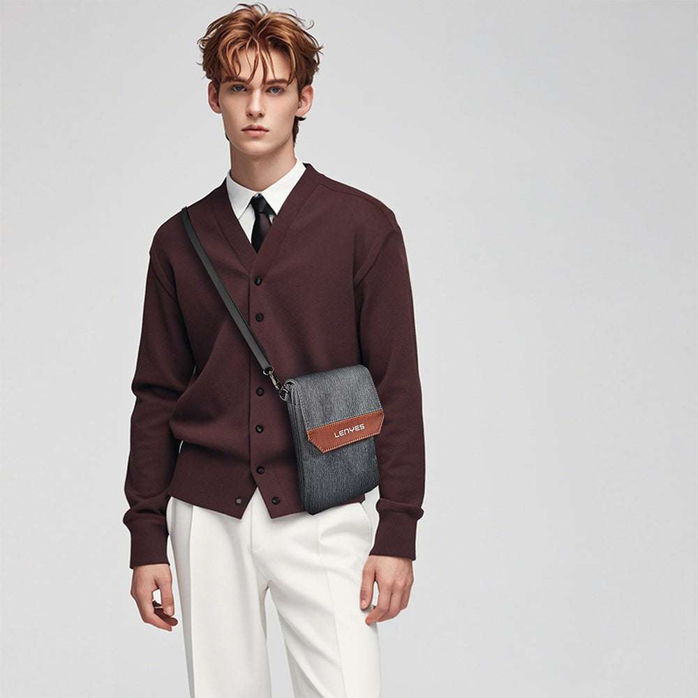 Lenyes LB546 mobil aksesuar çantası, zarif renk bloklu tasarımıyla tarzınıza modern bir dokunuş katıyor. Gri ve kahverengi kontrastın şıklığı, her ortamda göz alıcı bir duruş sunarken, çıkarılabilir omuz askısı ile ister elde ister çapraz askı şeklinde taşıma özgürlüğü tanıyor. Günlük şehir yaşamında cüzdan, kart, telefon gibi temel ihtiyaçlarınızı taşıyabileceğiniz bu kompakt çanta, minimalizmin en fonksiyonel halini yansıtıyor.