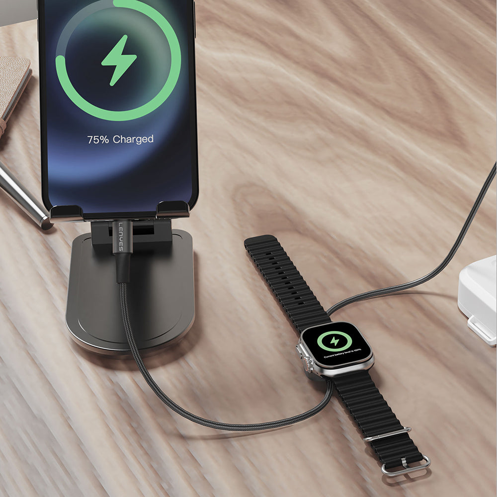 1.2 metre uzunluğu ile esnek kullanım sunan bu kablo, evde masa başında, dışarda kütüphane veya kafede ve seyahat esnasında pratiklik sağlar. Tek kabloyla hem telefonunuzu hem de saatinizi şarj etmek artık çok daha şık ve kolay.