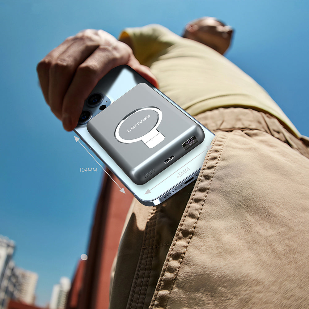 Lenyes PW1001D powerbank, 10.000 mAh kapasiteli lityum iyon polimer bataryasıyla enerjiyi cebinize taşır. Hem kablolu (22.5W) hem de kablosuz (15W) şarj desteği sunan bu akıllı güç bankası, güçlü mıknatısı sayesinde telefonunuza sağlam şekilde tutunur ve şarj etmeye başladığı an bağlantı sağlar. Günlük koşturmacanızda, iş yerinde veya dışarda bir kafede telefonunuzu priz aramadan şarj etmenin keyfini çıkarın.