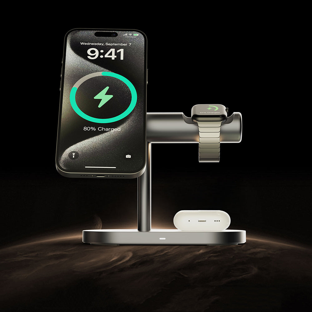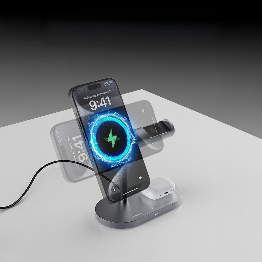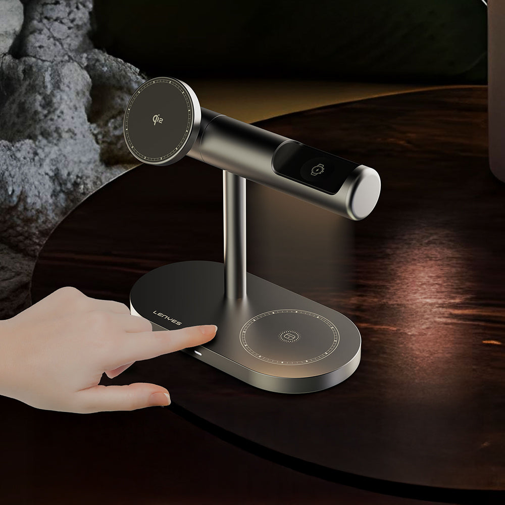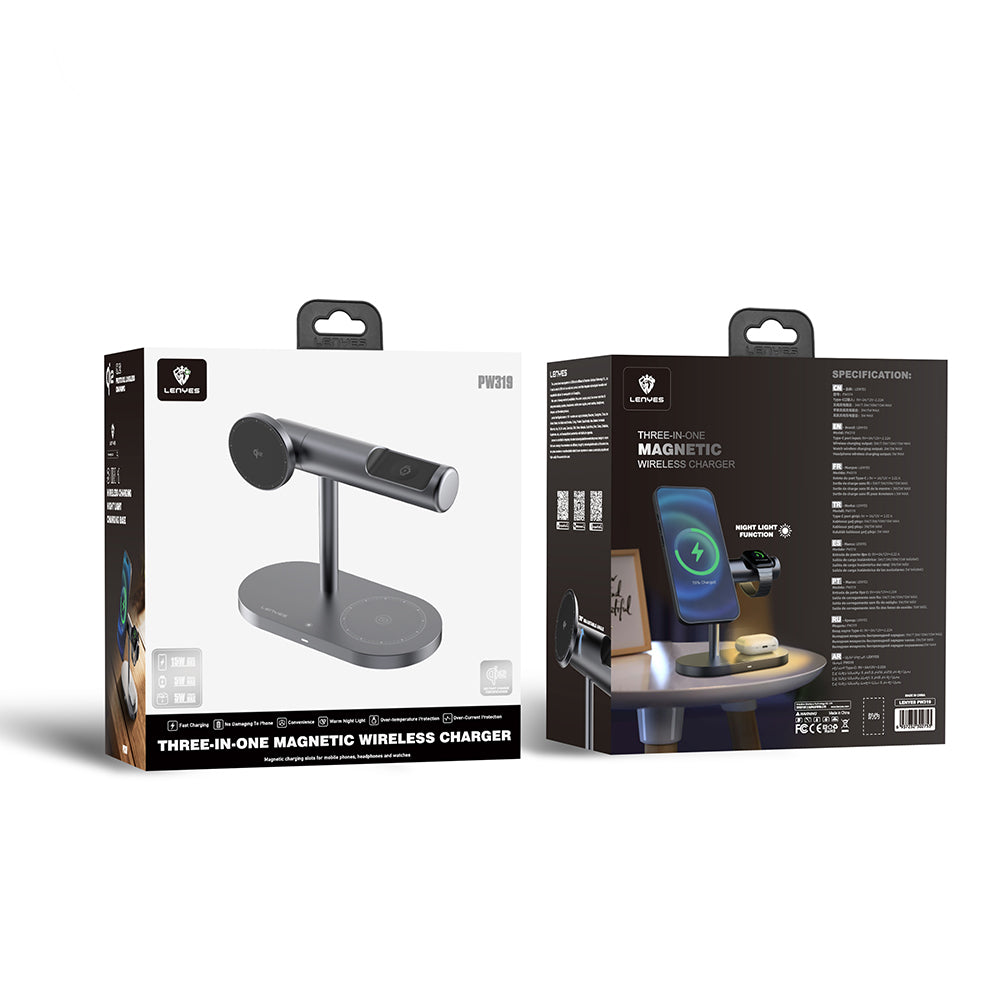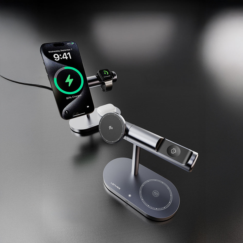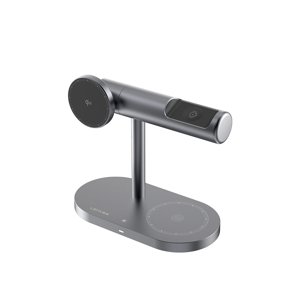 Lenyes PW319 Qi2 kablosuz şarj standı, telefon, akıllı saat ve kulaklıklarınızı aynı anda şarj etmenize olanak tanıyan yenilikçi bir çözüm sunuyor. Qi2 protokolü ile 15W’a kadar hızlı kablosuz şarj desteği sunan bu özel şarj istasyonu, güçlü mıknatıslı yapısı sayesinde cihazlarınızı güvenli bir şekilde tutar. Göz hizasına uygun 30° ayarlanabilir açılı tasarımı sayesinde hem kullanım konforunu artırır hem de masa başında estetik bir görünüm kazandırır.