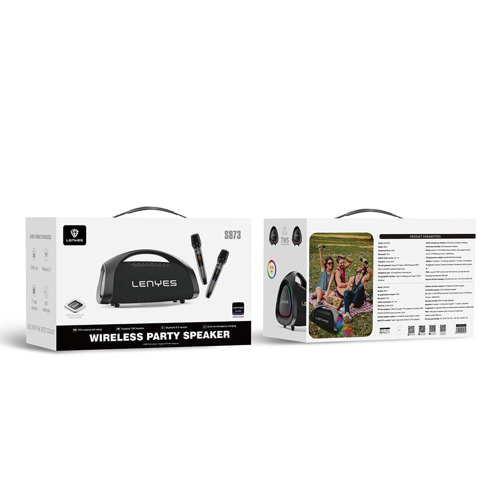 IPX6 su geçirmezlik seviyesi, Lenyes S873'ü açık hava etkinliklerinizde güvenle kullanmanızı sağlar. RGB aydınlatma efekti ile müzik ritmine uyum sağlayan atmosferik bir ortam yaratabilirsiniz. AUX, TF kart ve U disk bağlantı seçenekleriyle çok yönlü kullanım sunar, aynı zamanda TWS desteği sayesinde stereo ses deneyimini ikiye katlayabilirsiniz.